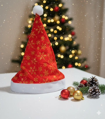 Caciula elegantă și festivă de Moș Crăciun cu fulgi aurii, ideală pentru a completa ținuta...