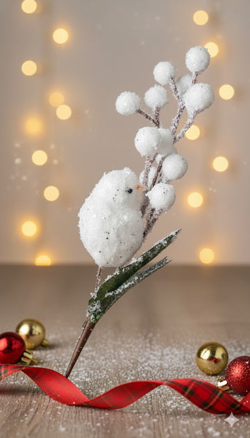 Crenguta decorativa cu pasare si bobite albe 30cm. Ornamentul înfățișează o pasăre albă așezată pe...