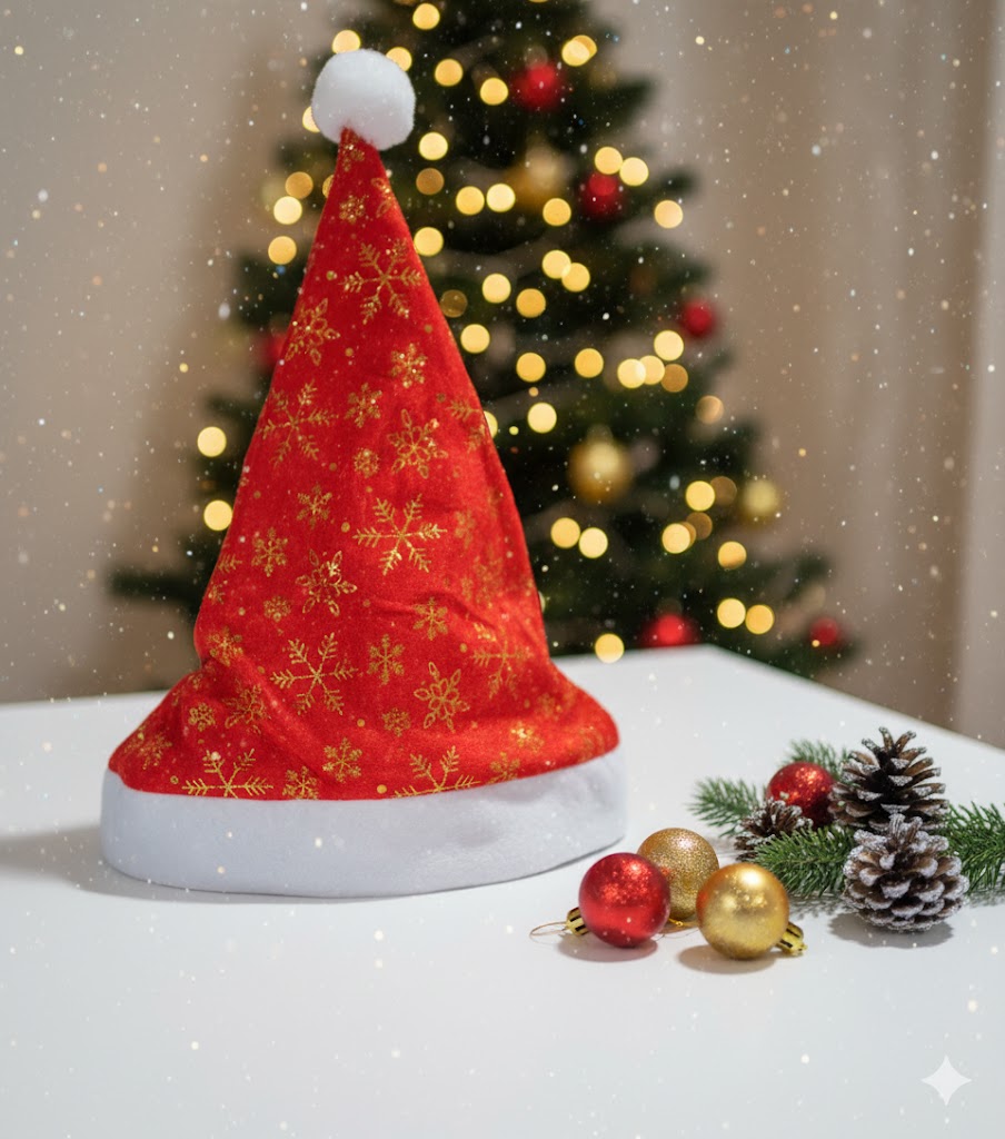 Caciula elegantă și festivă de Moș Crăciun cu fulgi aurii, ideală pentru a completa ținuta de sărbătoare și a intra în spiritul Crăciunului. Marginea este realizată dintr-un material alb, moale și pufos. Este finisată cu un ciucure pufos, alb, specific căciulii clasice a lui Moș Crăciun.